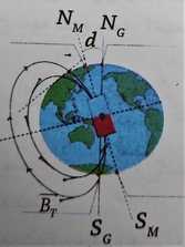 نعتبر الأرض مغناطيسا كبيرا, يميل محورها المغناطيسي عن محورها الجغرافي بزاوية تدعى زاوية الإنحراف