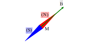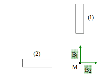في نقطة M يحدث تراكب حقلين مغناطيسيين ناتجين عن قضيبين مغناطيسيين متعامدين كما في الشكل. حيث شدة الحقلين هي